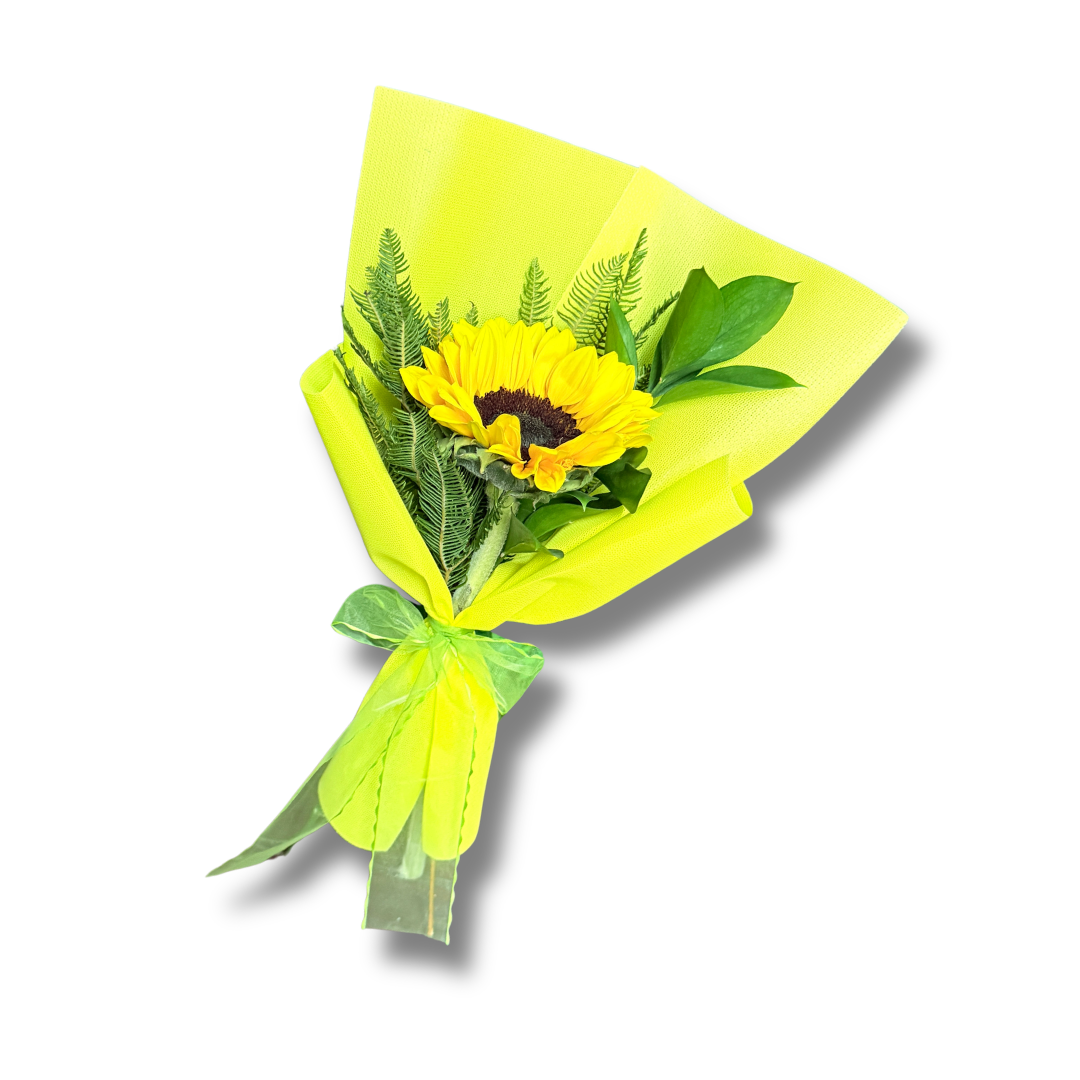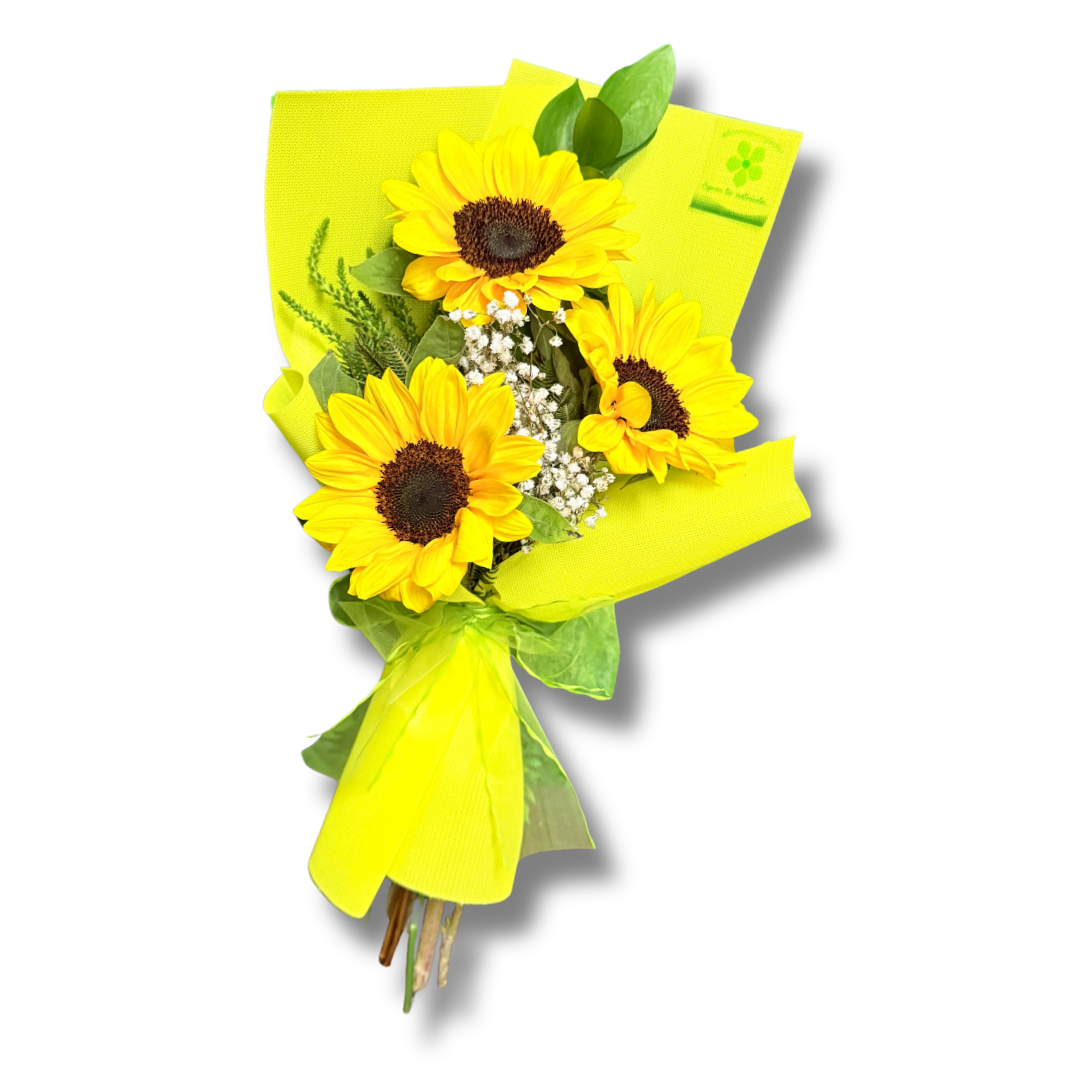 Ramo circular de girasoles de vivero y bombones en forma de corazón con fino follaje. Envuelto en papel tela.