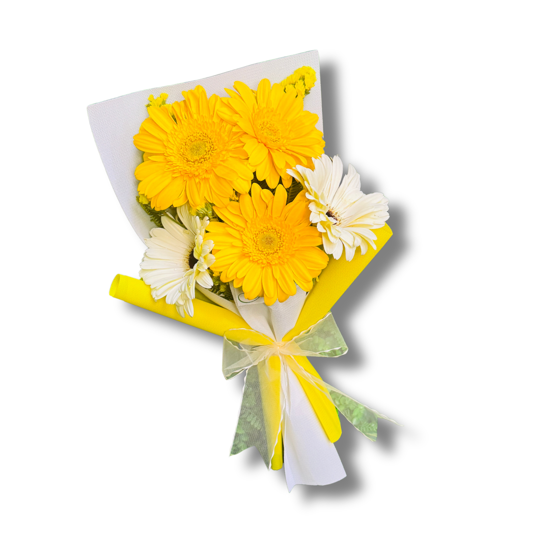 RAMO CIRCULAR DE 3 ROSAS Y 3 GERBERAS CON FINO FOLLAJE. ENVUELTO EN PAPEL TELA.